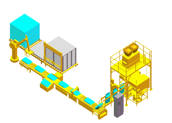 經(jīng)前面工序檢測合格的產(chǎn)品被輸送至碼垛輸送機(jī),由碼垛機(jī)器人按設(shè)定好的碼垛方式自動包裝袋搬運到托板上,達(dá)到取代人工搬運、節(jié)約成本、提高勞動效益的目的。
