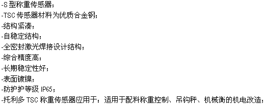 TSC-200kg稱重傳感器材料為優質合金鋼,長期穩定性好,應用于配料稱重控制、吊鉤秤、機械衡的機電改造等。(TSC-200kg weighing sensor material is high quality alloy steel, good long-term stability and application in the weighing control, hook scales, mechanical and electrical transformation of mechanical equilibrium, etc.)