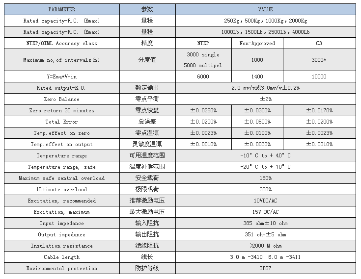 特迪亞3410-500KG稱重傳感器產品參數表: