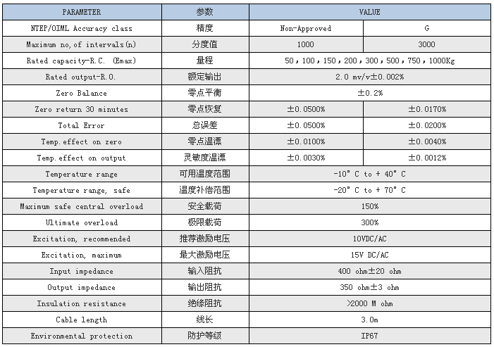 ——————————特迪亞616-50kg稱重傳感器產品參數表——————————