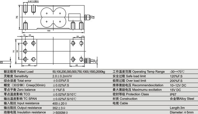 美國(guó)SUNCELLS ILB-100kg稱重傳感器中文參數(shù):