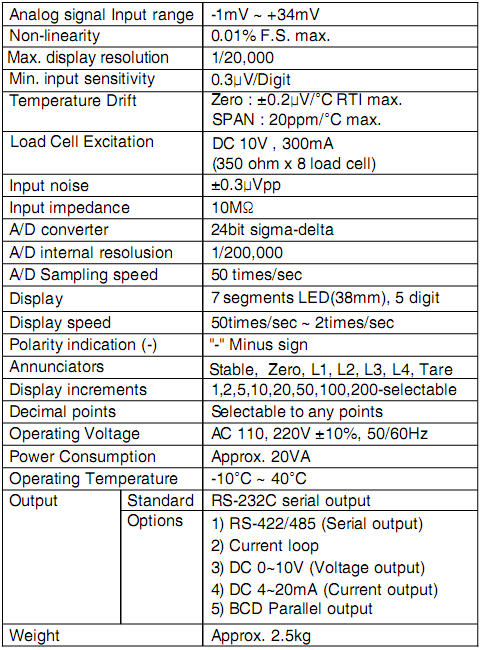 韓國Bongshin BS7300XL稱重儀表技術(shù)指標(biāo)