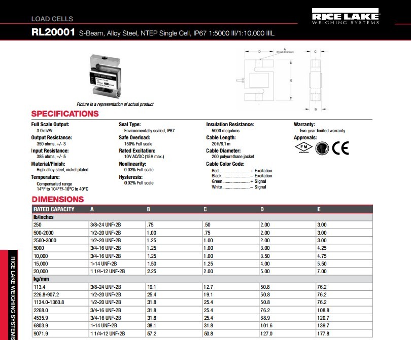 美國RICELAKE RL20001稱重傳感器非常適合于大規模轉換,張力的應用程序和通用稱重。緊湊和堅固的設計。容量從250到20,000磅(113.4至9071.9千克的)。完成20'/ 6.1米的稱重傳感器電纜。