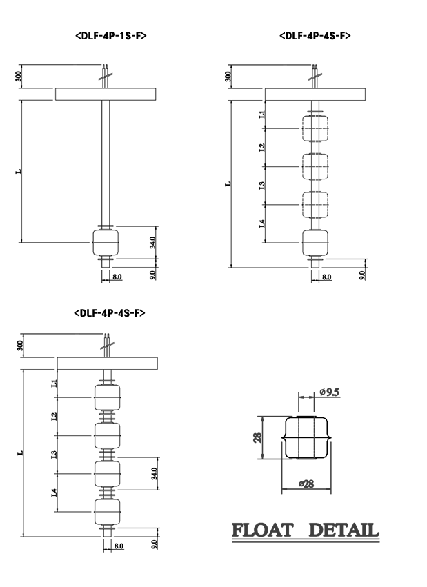 DLF是控制體積小坦克迷你浮球液位開關,在傳感器簧片開關操作為浮子上下移動,其中安裝了一個永久磁鐵,這是一個使用通/斷信號從中繼級別開關。DLF - 4P(點)- 4SSTS- F(法蘭)是控制4 4花車每個接觸點液位開關,根據用戶的選擇,它可以產生輸出最多4個觸點信號。
