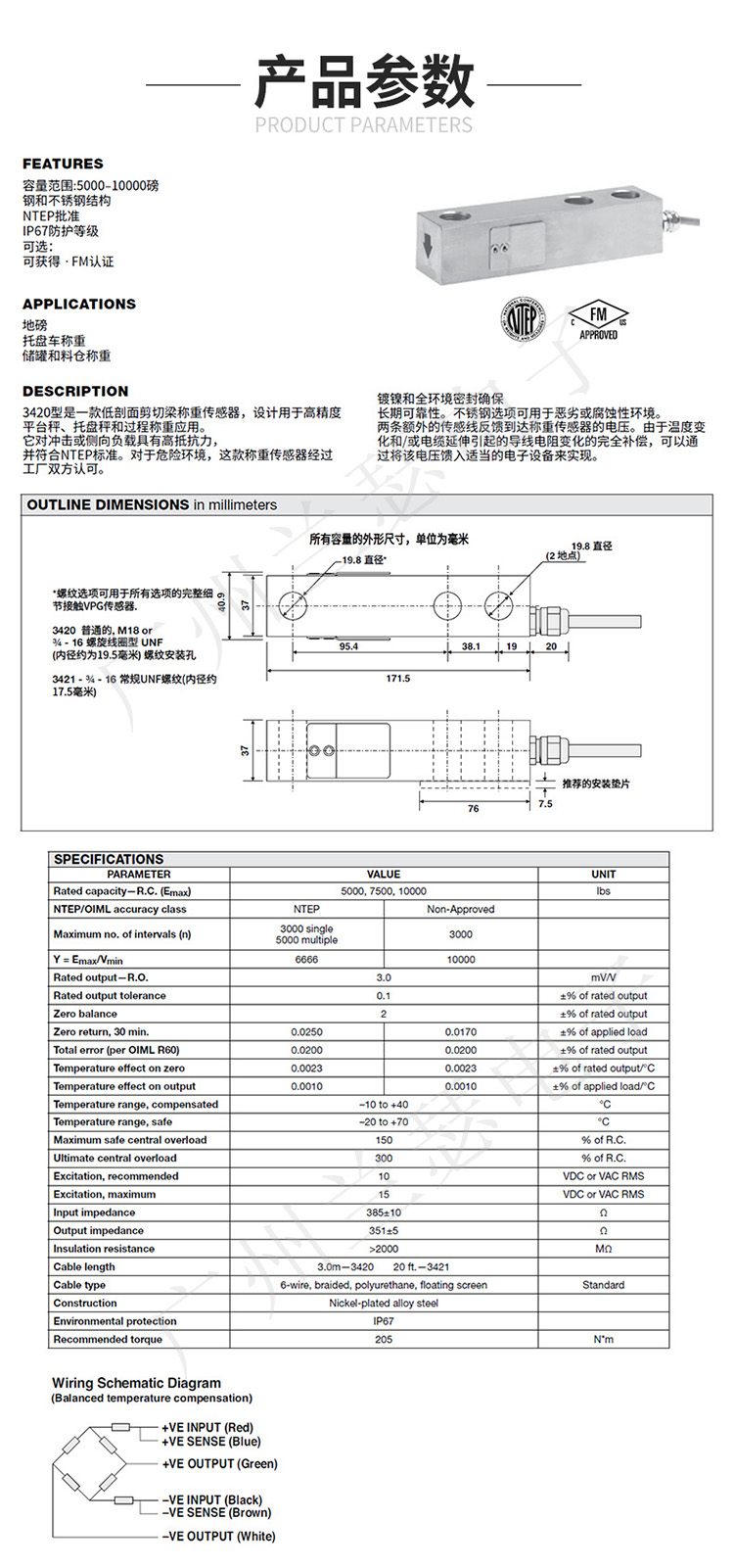 美國(guó)Tedea 3420稱重傳感器產(chǎn)品參數(shù):