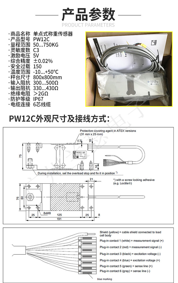 PW12CC3/100KG稱重傳感器最大秤臺面積 800 x 800 mm. 標準電纜為3 m長屏蔽6線電纜同樣,我們還提供 更長的電纜長度 (最大 12 m), 可調整的輸出或更小的檢定分度(vmin),另外所有的PW10A 都提供防爆型號 (按照 ATEX 95 (Zone 1, 21; Zone 2,22).