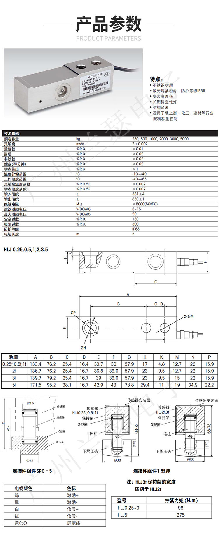 瑞士梅特勒托利多HLJ-0.25T稱重傳感器基本特性: