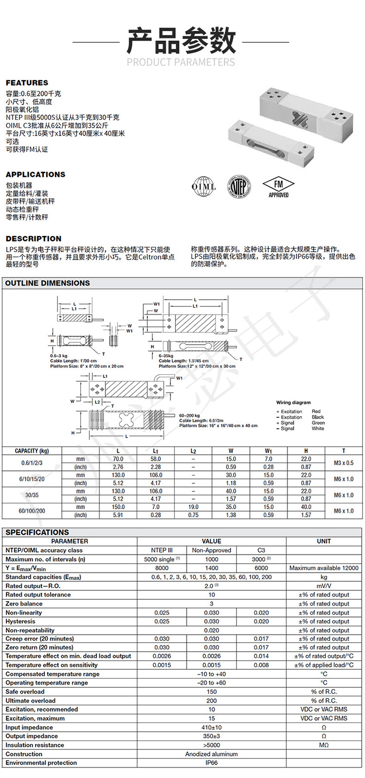 Celtron LPS-6kg單點式稱重傳感器應(yīng)用:平臺秤,包裝機,計量/灌裝,皮帶秤/輸送機秤,運作檢查秤,零售秤/計數(shù)秤。