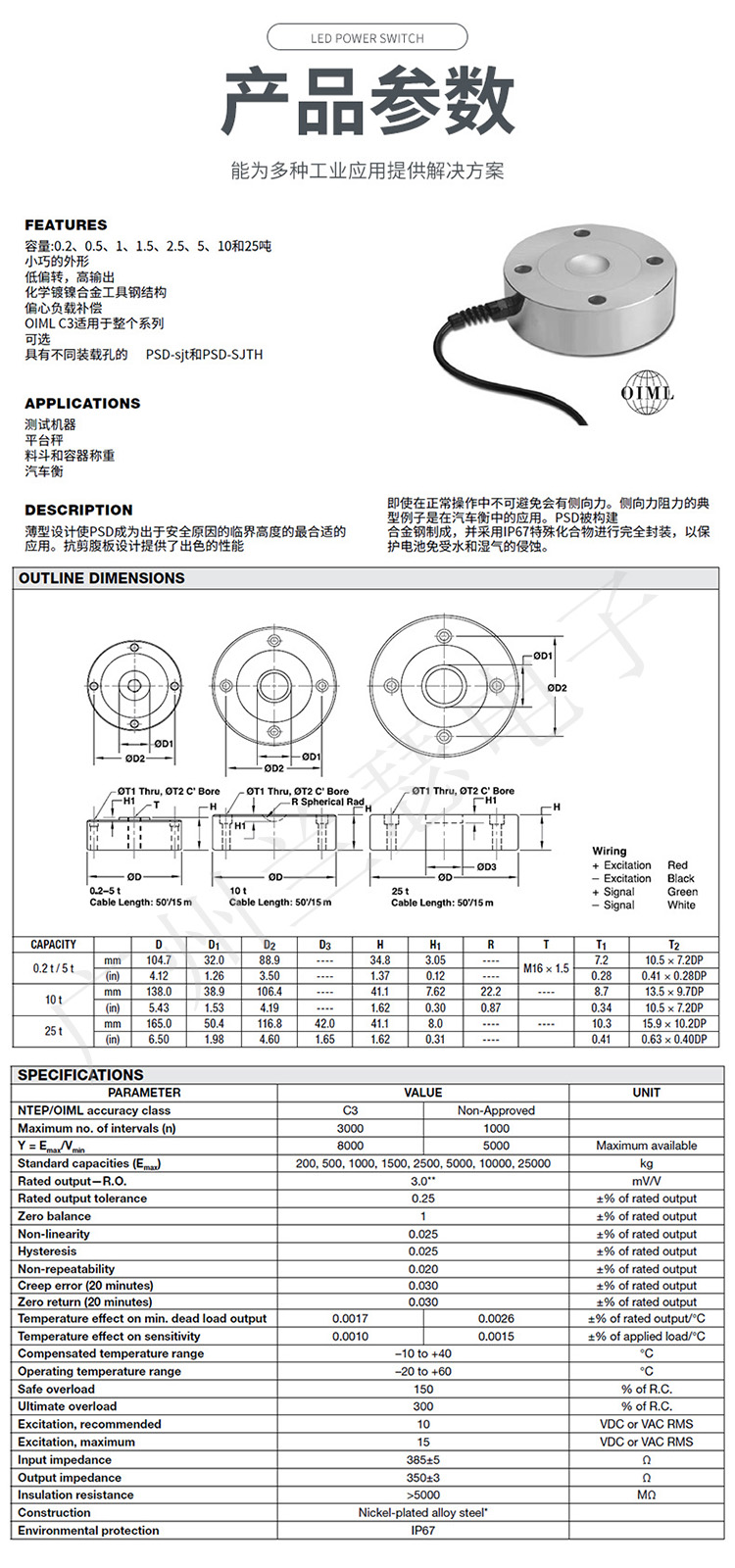 美國Celtron PSD-5t稱重傳感器產品參數: