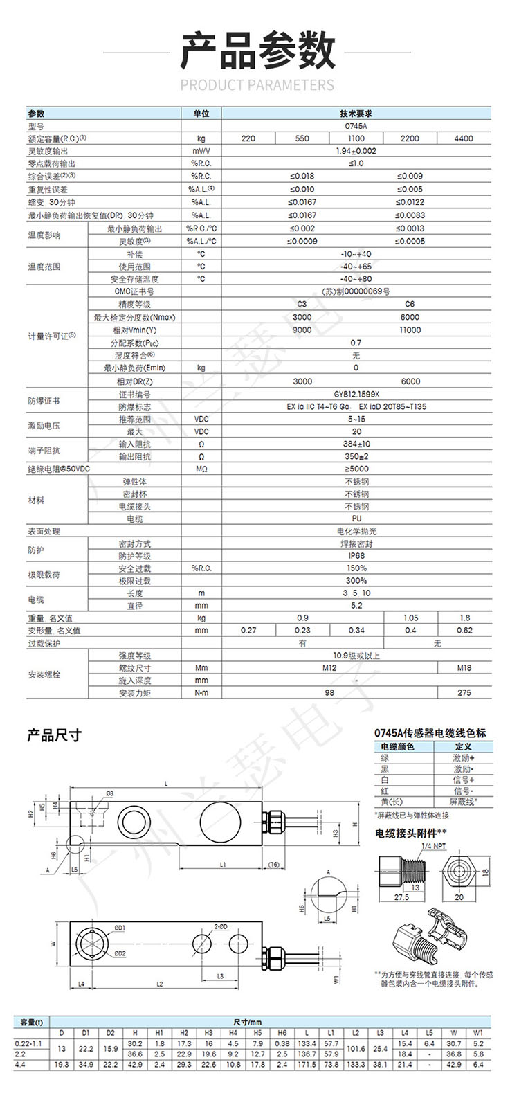 0745A-2.2是剪切梁傳感器,適用于惡劣的工業環境。常用于防爆區域,平臺秤和中型罐體的稱量。0745A-2.2傳感器標準量程為 220 kg, 550 kg, 1.1 t, 2.2 t, 4.4 t。