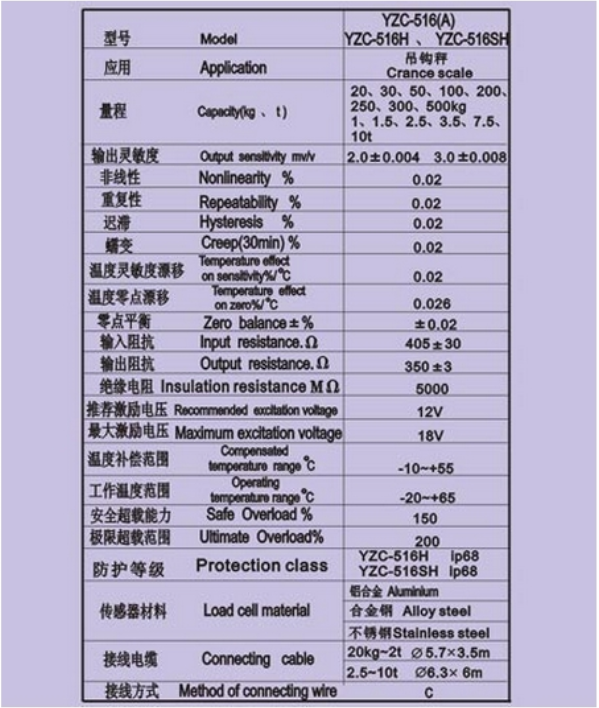廣測GUANGCE YZC-516稱重傳感器技術(shù)參數(shù)