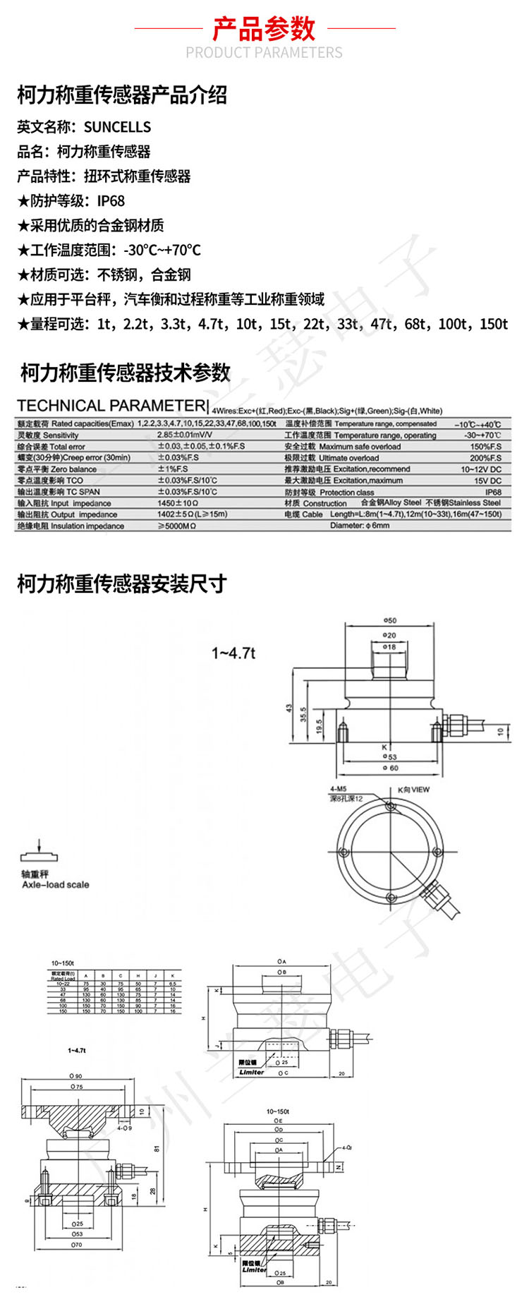 扭環式傳感器;優質合金鋼材質;防護等級IP 68,具有很好的防水防濕功能,量程齊全,高精度;適用于料平臺秤,汽車衡和過程稱重等工業稱重領域。
